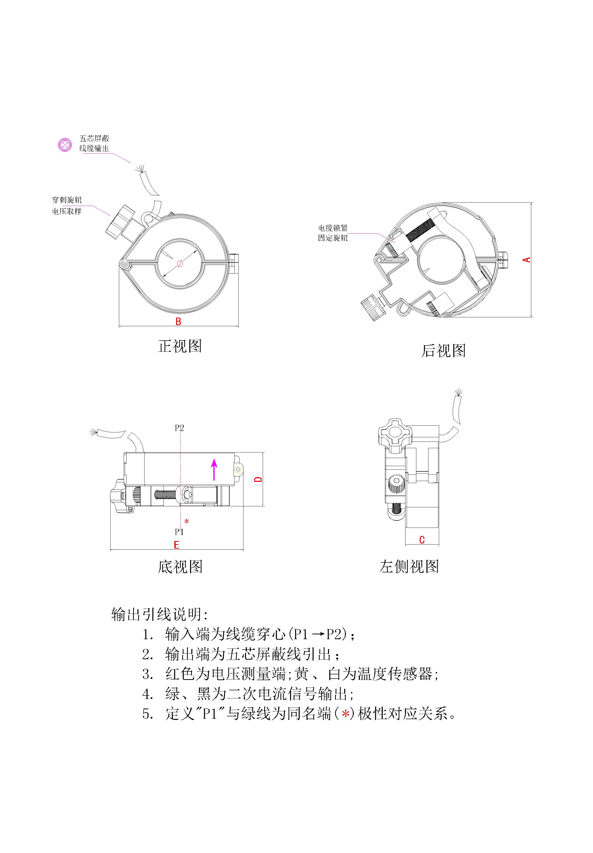 TR-D系列开合式户外防水穿刺取电测温电流互感器,具有电流测量,穿刺针电压取电,线缆温度采集的功能。集约化一体式设计,开合结构,安装方便。推荐一次额定电流50A~600A,二次输出为五芯屏蔽线引出。输出信号为二次电流、一次电压以及线缆温度,有效提供线路实时信息。拥有良好的线性,可以实现多个传感器的功能,广泛配套于多功能电力仪表。